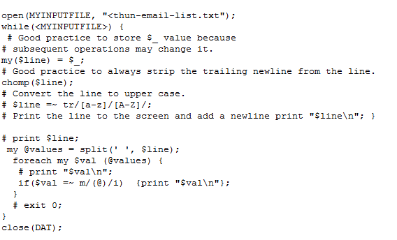 (Note: it differs somewhat from the following, as HTML is mis-reading the lines and omitting them from view.) (Highlight,copy & paste this. Then fill in the missing file name, etc.) open(MYINPUTFILE, ") { # Good practice to store $_ value because # subsequent operations may change it. my($line) = $_; # Good practice to always strip the trailing newline from the line. chomp($line); # Convert the line to upper case. # $line =~ tr/[a-z]/[A-Z]/; # Print the line to the screen and add a newline print "$line\n"; } # print $line; my @values = split(' ', $line); foreach my $val (@values) { # print "$val\n"; if($val =~ m/(@)/i) {print "$val\n"}; } # exit 0; } -------- Next, I copied "findperl.pl" to "findperl2.pl" and edited three lines of it: