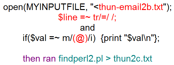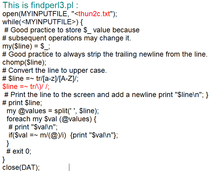 This is findperl3.pl : (highlight,copy & paste this:)Then fill in the missing file name, etc open(MYINPUTFILE, ") { # Good practice to store $_ value because # subsequent operations may change it. my($line) = $_; # Good practice to always strip the trailing newline from the line. chomp($line); # Convert the line to upper case. # $line =~ tr/[a-z]/[A-Z]/; $line =~ tr/\)/ /; # Print the line to the screen and add a newline print "$line\n"; } # print $line; my @values = split(' ', $line); foreach my $val (@values) { # print "$val\n"; if($val =~ m/(@)/i) {print "$val\n"}; } # exit 0; } close(DAT);