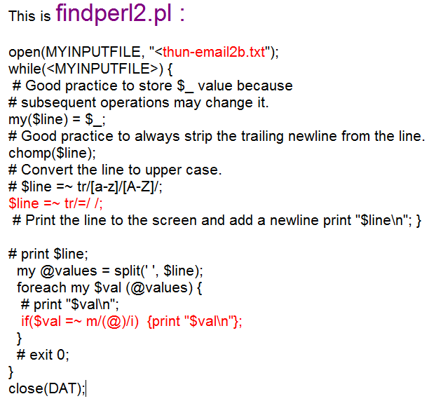 This is findperl2.pl :(highlight,copy & paste this. Then fill in the missing file name, etc. open(MYINPUTFILE, ") { # Good practice to store $_ value because # subsequent operations may change it. my($line) = $_; # Good practice to always strip the trailing newline from the line. chomp($line); # Convert the line to upper case. # $line =~ tr/[a-z]/[A-Z]/; $line =~ tr/=/ /; # Print the line to the screen and add a newline print "$line\n"; } # print $line; my @values = split(' ', $line); foreach my $val (@values) { # print "$val\n"; if($val =~ m/(@)/i) {print "$val\n"}; } # exit 0; } close(DAT);