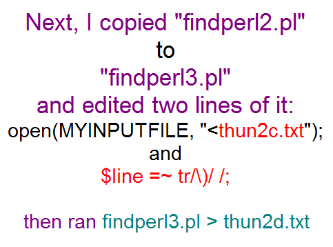 The following are Perl scripts to whittle down the Collected Addresses raw file "History.mab" to just the email addresses. There are three steps, (three Perl scripts to execute.) I copied "History.mab" to a file called "thun-email-list.txt" After running the first Perl script, there will be about about 9 extra characters on each line, such as (DE=8080) Next, I created a Perl file from Notepad and named it "findperl.pl" Then I ran it by typing findperl.pl > thun-email2b.txt -- This is findperl.pl